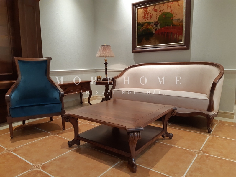 . Sofa dài có tựa gỗ tự nhiên, bọc nệm màu nâu phong cách Indochine, mang lại vẻ đẹp quyền lực, sự sang trọng cho không gian và thể hiện gu thẩm mỹ tính cách của gia chủ.